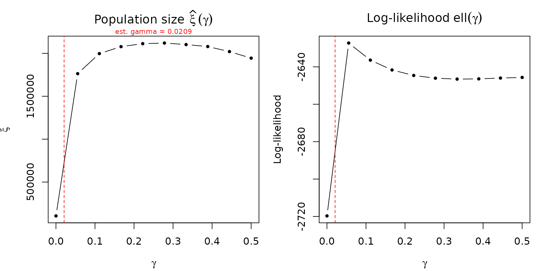 If the original model estimated gamma, its point estimate is marked with a dashed red vertical line. The xi profile shows whether the population-size estimate is stable (flat) or sensitive (steep) across the gamma range.