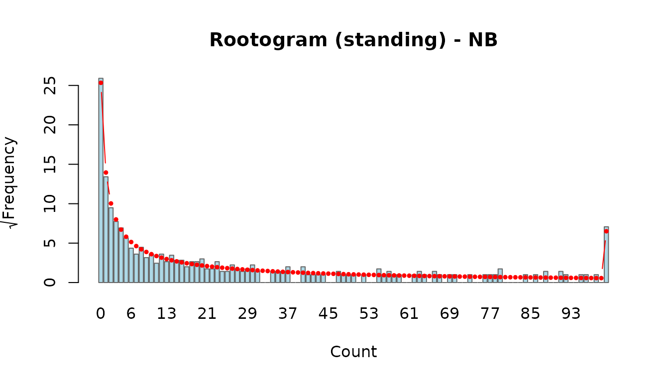 Rootograms (Kleiber & Zeileis, 2016) compare the observed and fitted count-frequency distributions directly. Three display styles are available: