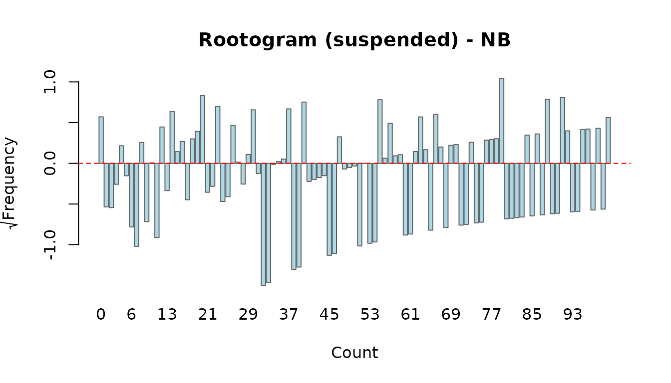 Compare the two: if the Poisson rootogram shows bars consistently hanging below the zero line at small counts and above at moderate counts, this is a classic overdispersion signature that the NB model should correct.