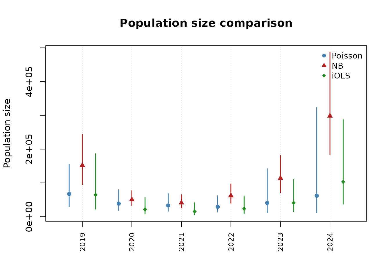 #> Population size comparison: Poisson vs NB vs iOLS
