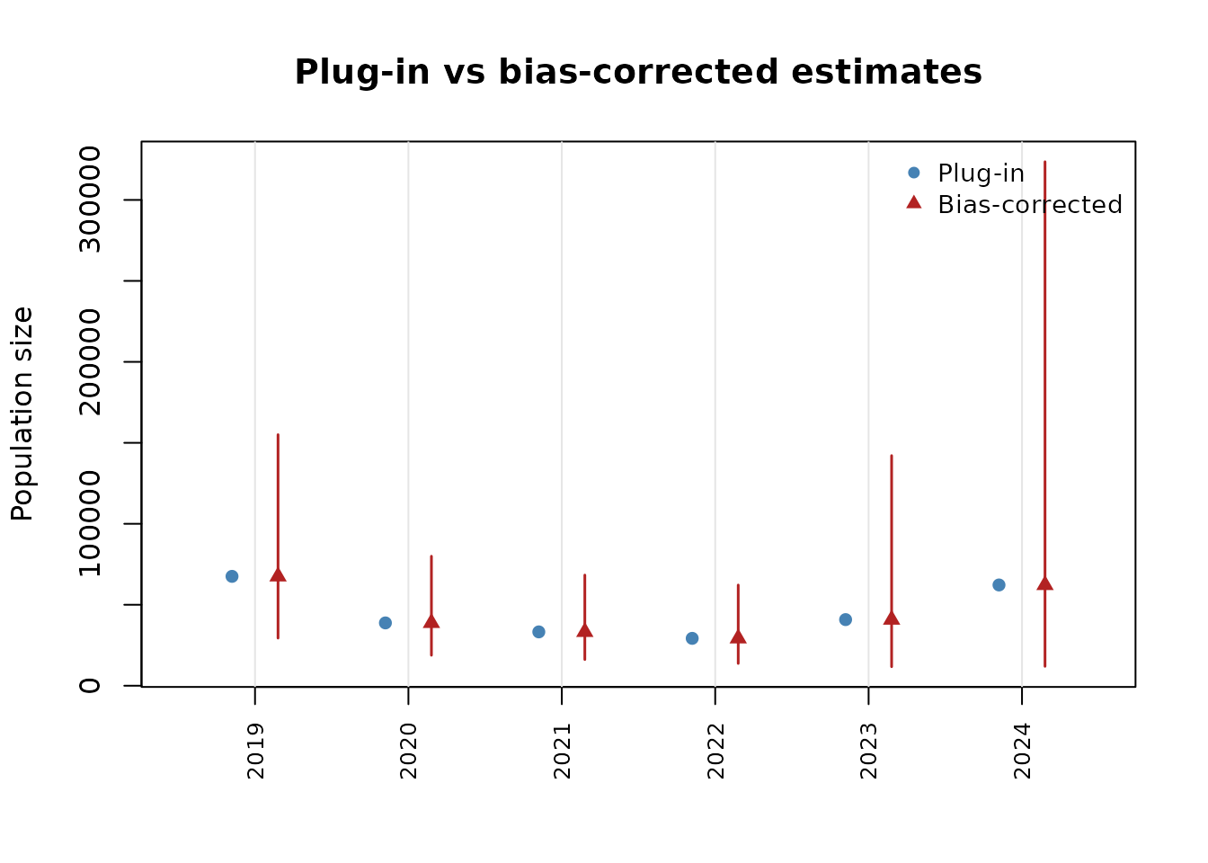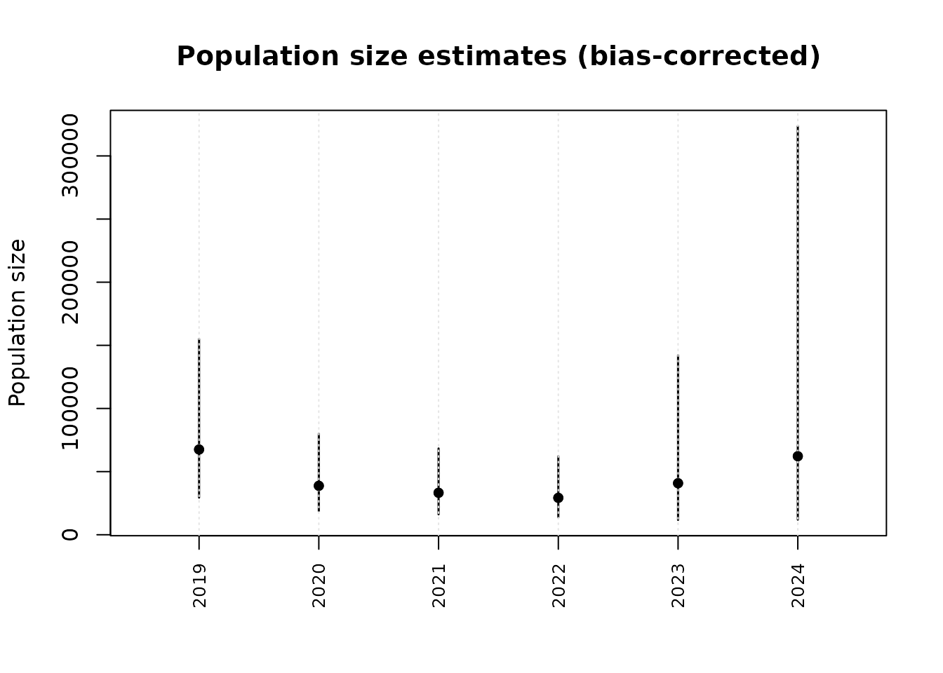 #> 1 POISSON 1382 -8775.519 17569.04 17616.12 14948.24 1373Plotting population size estimates