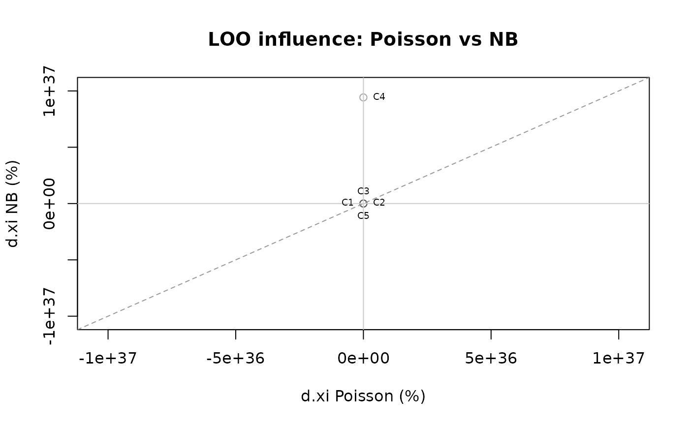 Purpose. When comparing two model specifications (e.g., Poisson vs NB, or different covariate sets), it is useful to check whether the same observations are influential under both models, or whether influence patterns diverge.